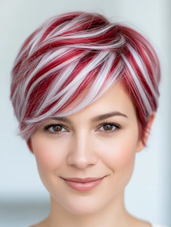 Holiday Candy Colors bring a fun, playful, and sweet look to short hair using bright festive shades inspired by classic Christmas candies. Think cheerful pops of red, green, white, pink, or pastel blue. This look is colorful, bold, and perfect for anyone who loves a joyful, creative holiday makeover.