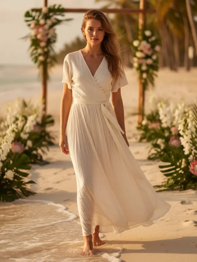 Pleated maxi dresses are a beautiful option for Mexico beach weddings because they add texture and movement without extra weight. The pleats catch ocean breezes and create graceful motion while walking or dancing. Choose soft, flowing pleats rather than stiff ones for comfort. This style offers structure and elegance while remaining light enough for warm, outdoor wedding settings.