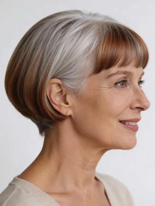 A short bob paired with side bangs helps soften facial features while keeping hair light and breathable in summer. Side bangs gently frame the eyes and reduce the appearance of forehead lines. This hairstyle is easy to style, works well with fine or thinning hair, and stays neat even in warm, humid conditions.