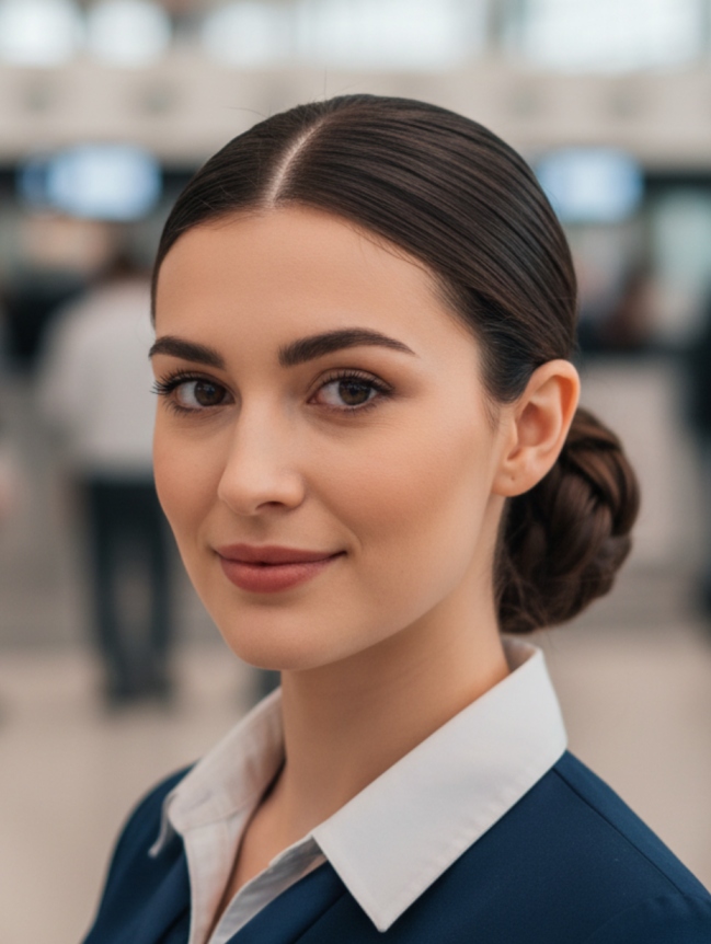 Classic Bun: The Timeless Elegance is a signature cabin-crew look—clean, confident, and airline-approved. It keeps hair secure through long flights while looking polished in every angle.
